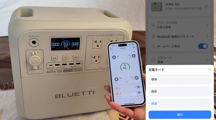 『AORA100』は【標準・高速(ターボ)・静穏】の3つのAC充電モードを選べます。