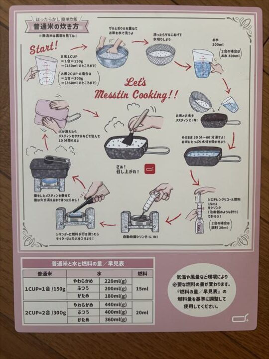 イラスト付きのわかりやすい説明書もついているので、「一度もアルコールストーブでご飯を炊いたことがない」という人でも失敗なくおいしいご飯を炊くことができますよ。