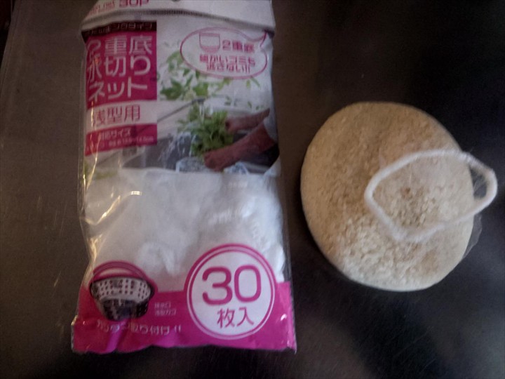 米を100均などでも売っている水切りネットに入れて、30分浸水させザルで水切りし、ジップロックに入れて持っていくと、米が袋にくっつくことなくきれいに取り出せます。