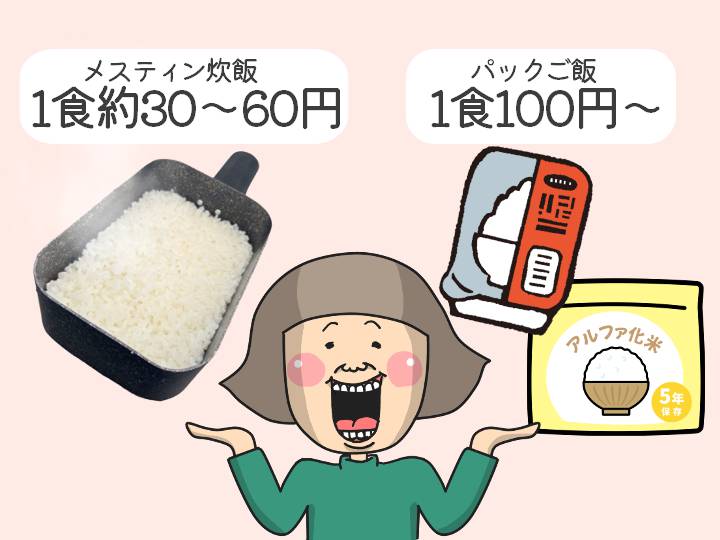メスティン炊飯なら一食あたり約30円~60円で、ホカホカのおいしいご飯が食べられます!(米の価格によって変動)