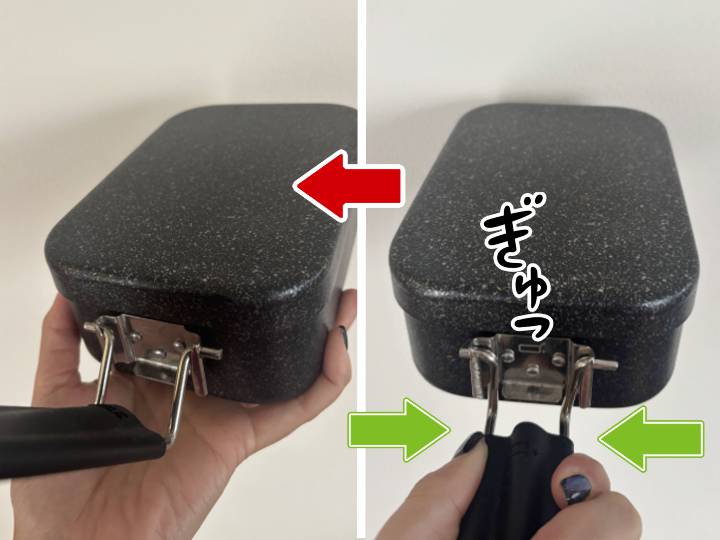 d+メスティンは取っ手がしっかりロックされているので、まったくグラつきがなく、揺らしたり逆さにすることもラクにできます。